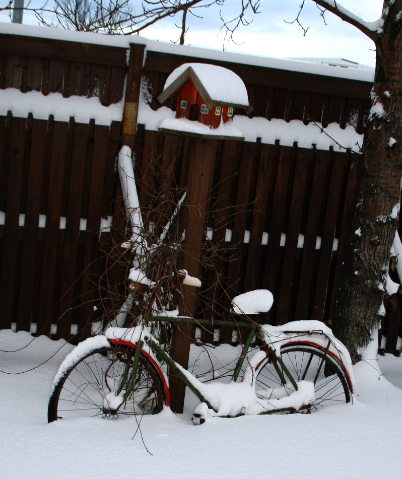 This is our patio table and below is my old bike rather stuck in the snow.